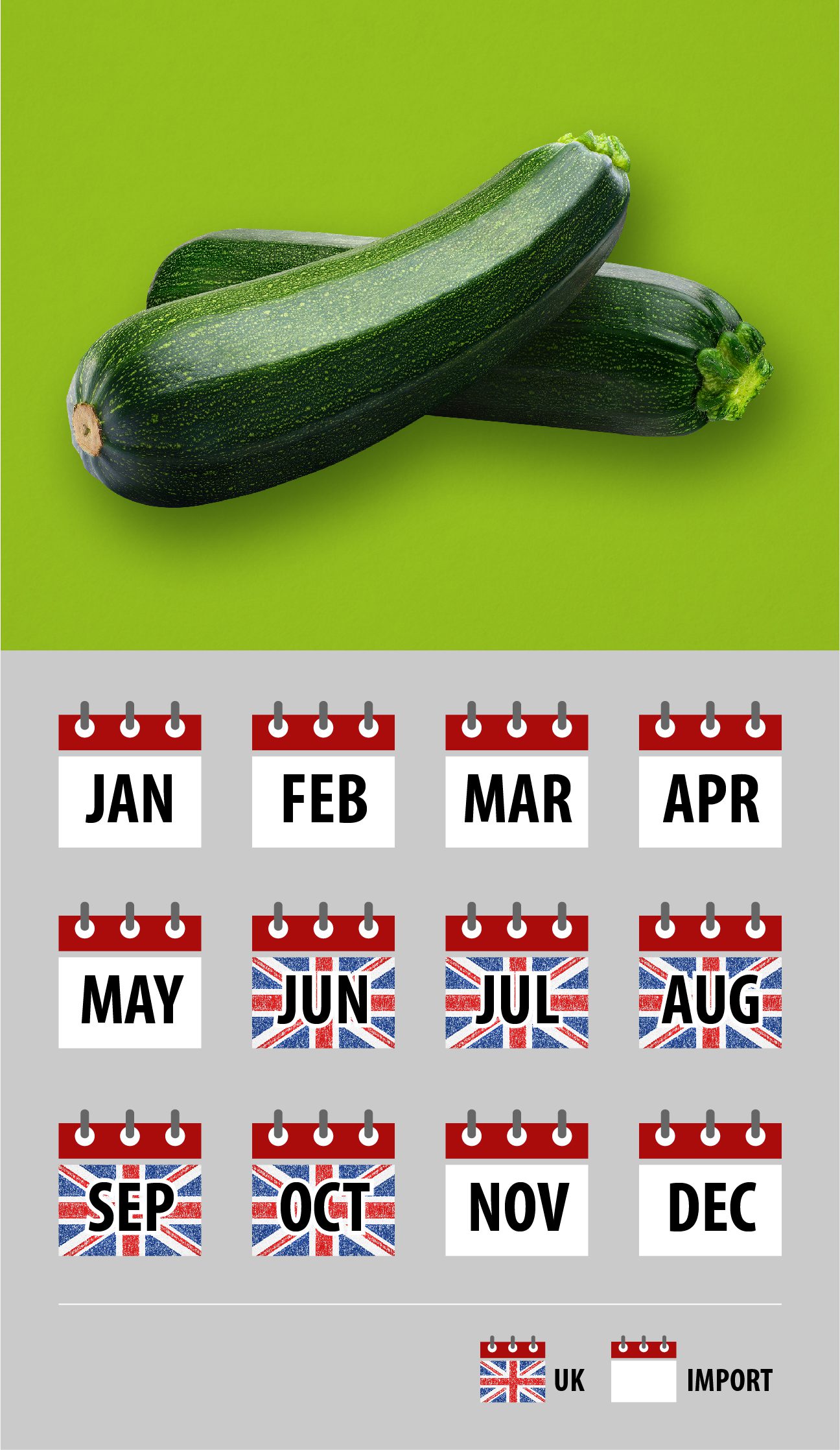 The UK courgette season runs between June and October, with Spanish and Moroccan crops available across the winter and spring months.